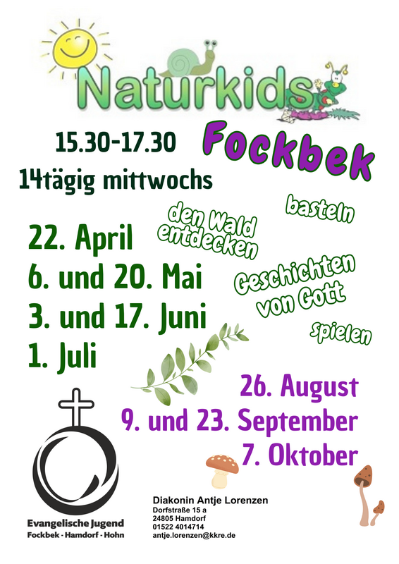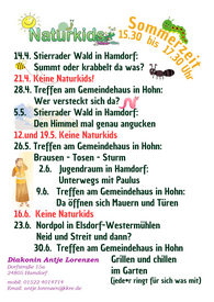 Die Termine und Treffpunkte für Fockbek, Hamdorf und Hohn öffnen sich mit einem Klick auf die Plakate. Mal sind die Naturkids im Stierrader Wald unterwegs, wo Tümpel und ein Bach für Abenteuer sorgen. In Hohn spielen die Kinder gerne im Familienpark hinter der Kirche oder im Wald, gehen auf den Spielplatz an der Schule oder besuchen das Ottergehege.