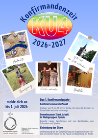 Die Konfirmandenzeit startet mit dem Beginn der 4. Klasse der Grundschule, um die Konfirmation (voraussichtlich2031/32) vorzubereiten. Ein Überblick über die gesamte Zeit von KU4 bis zur Konfirmation ist unter "Überblick Konfirmandenzeit zu finden. Für dieses erste Konfirmanden-Jahr, „KU4“ genannt, treffen sich die Kinder einmal pro Monat freitags von 15 bis 18 Uhr in Hamdorf.
