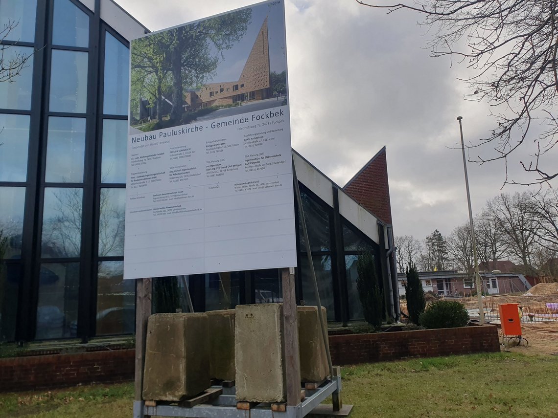 Der Blick aus Richtung des ehemaligen Küsterhauses zeigt, wie breit der Kopfbau der Kirche ist, der bestehen bleibt.