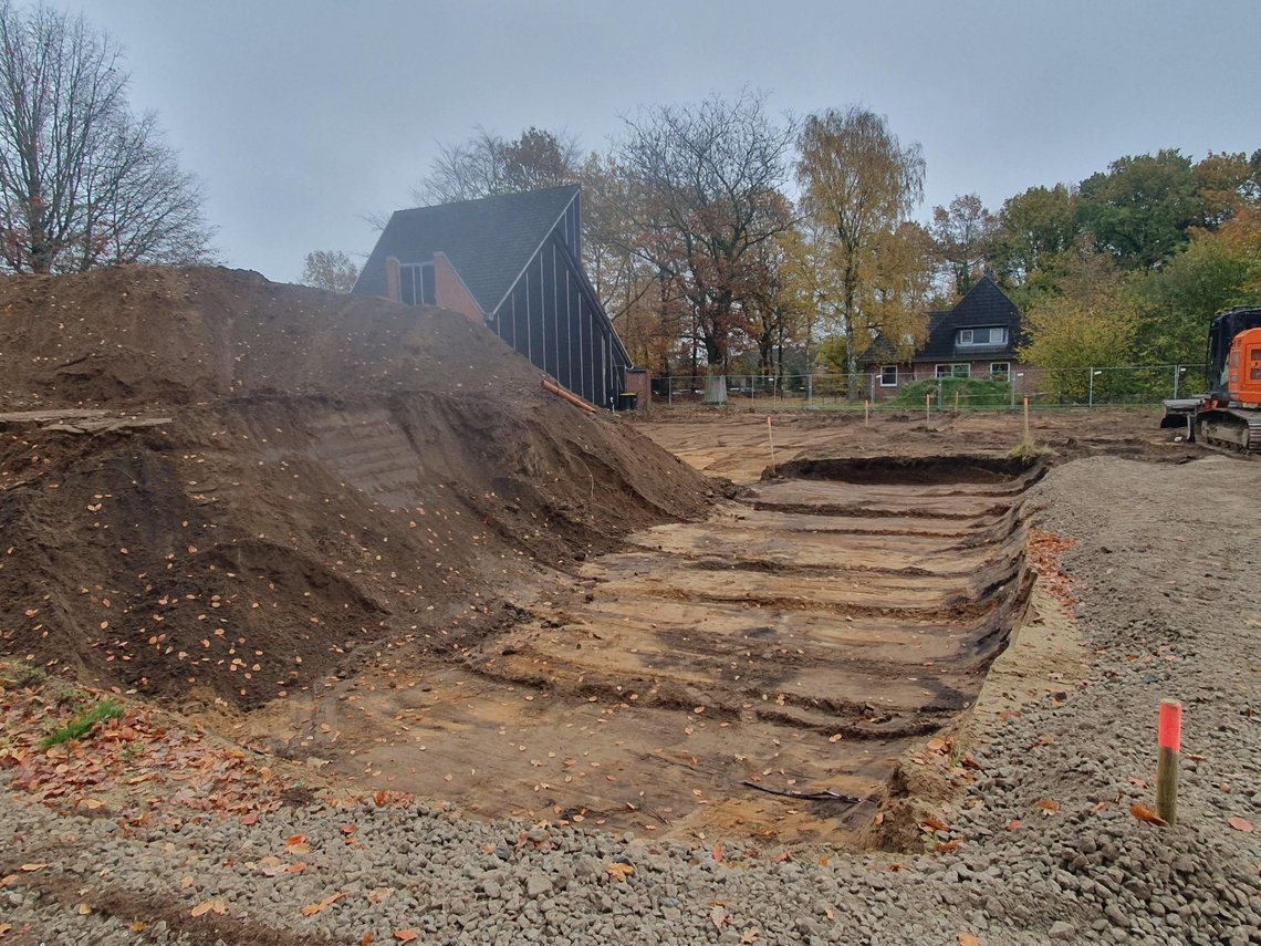 Im Abendlicht liegt die Baustelle still, hinten sichtbar noch das Küsterhaus.